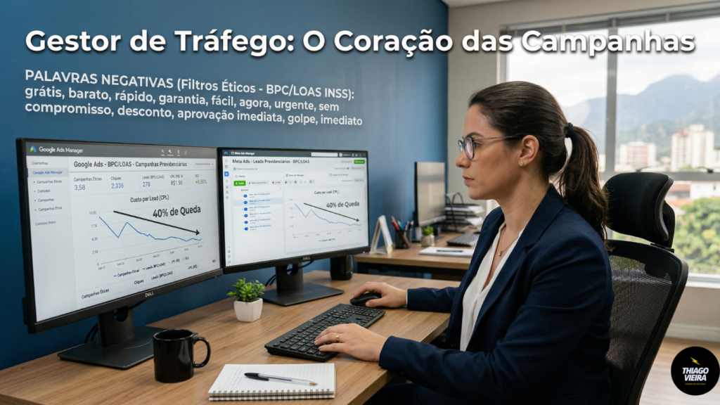 Sem esse cara, seu dinheiro some em cliques vazios. Ele roda Google e Meta Ads, testa criativos e corta gordura pra um escritório previdenciário digital que lucra de verdade. Foco em BPC/LOAS em áreas vulneráveis, com A/B que derruba custo por lead em 40%.