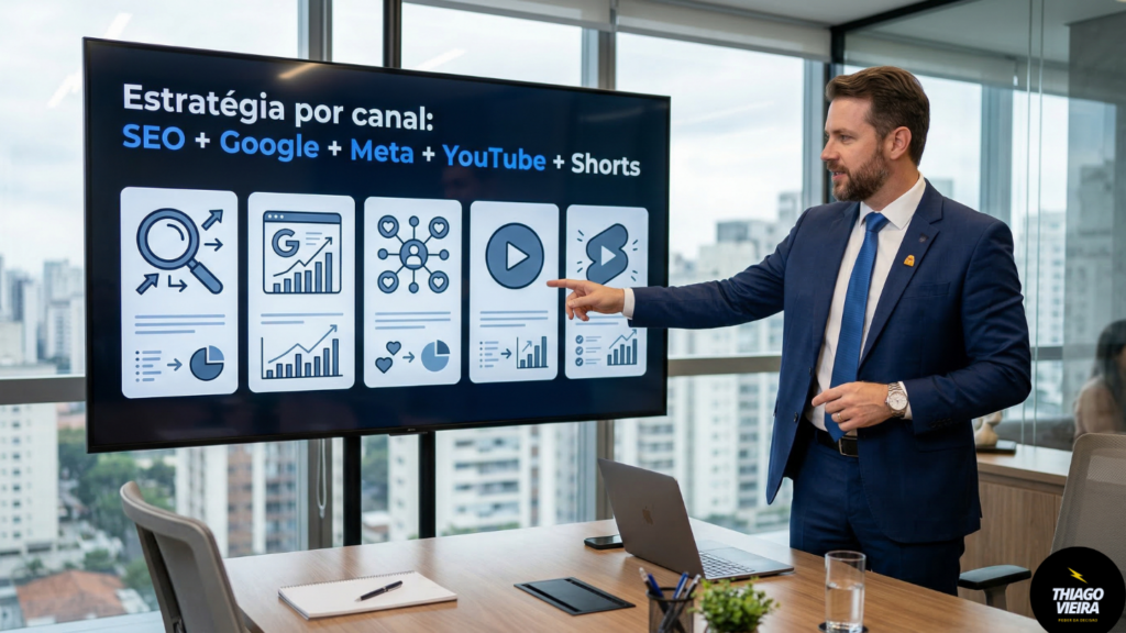 - Estratégia por canal: SEO, Google, Meta, YouTube e Shorts