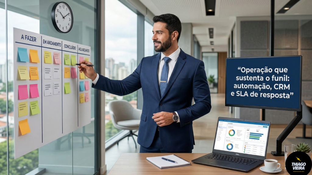 Sem operação, o funil vira caos. O anúncio traz volume, mas quem transforma volume em contrato é o processo interno: triagem, organização e acompanhamento. Sem isso, você cria a pior situação possível: paga pelo lead e perde no atendimento.